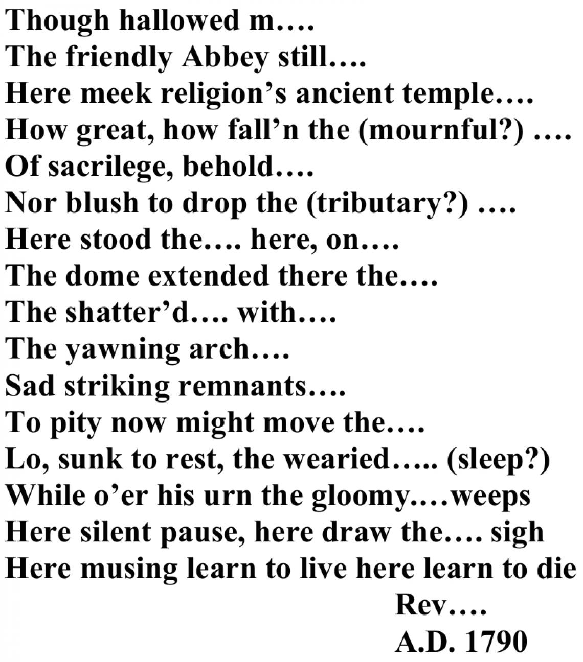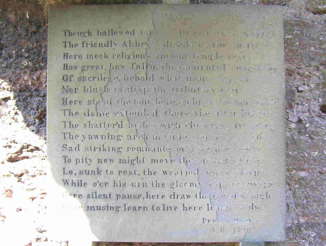 On the fractured arch of the chancel I found an eighteenth century stone plaque, a poem by the Reverend Joseph Reeve that pays homage to the abbey ruins. Over time, this plaque has itself become a ruin, so badly weathered down one side that only parts of the verse remain legible. The elements had somehow bridged the six hundred year divide between the observer and the observed, leaving me acutely aware that our own endeavours will all too soon be eroded to dust.